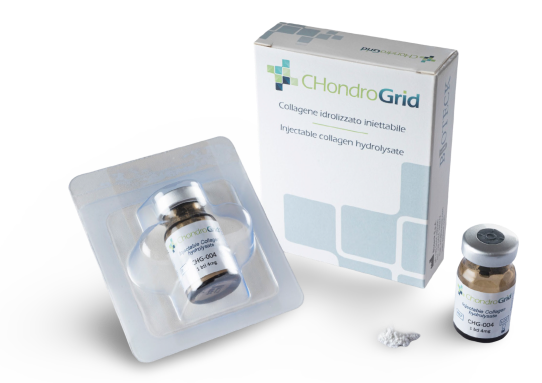 CHondroGrid® je inovativní infiltrativní prostředek na bázi hydrolyzovaného kolagenu s nízkou molekulární hmotnosti ( < 3,3 kDa). Tento hydrolyzát kolagenu je živočišného (hovězího) původu a svým působením posiluje mimobuněčnou matrix. Pro zajištění maximální stability je v přípravku obsažen ve formě mrazem sušeného prášku. Přispívá ke snížení bolesti a regeneraci funkce velkých kloubů a svalů, šlach a vazivových struktur. Bez potenciálního rizika přenosu prionových onemocnění. CHondroGrid® mohou podávat pouze odborníci praktikující infiltrativní terapie: ortopedi, revmatologové, sportovní lékaři a odborníci specializující se na léčbu bolestI.